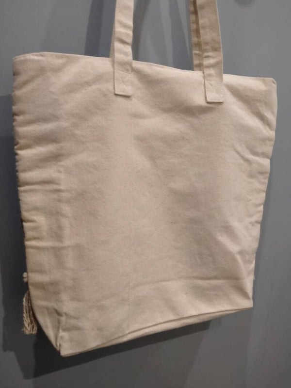 Grand sac en jute et toile de coton épaisse de couleur écru, tissage façon macramé. Grande poche intérieure, 3 pochettes plaquées dont une zippée. En sac fourre-tout ou en touche déco bohème!