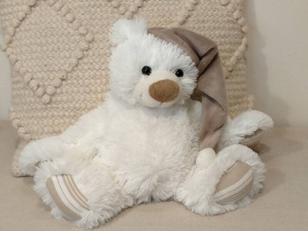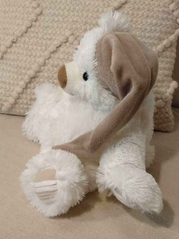 Ours au bonnet de nuit. En peluche blanche à poils longs, bonnet beige et pompon blanc, dessous des pattes en tissu rayé lin et blanc façon matelas ancien. Parfait en déco sur un lit!