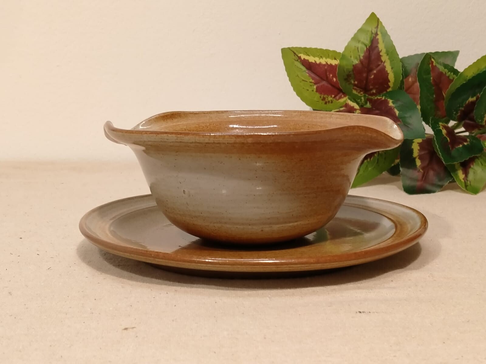 Saucière vintage à 2 becs de fabrication française (estampillée), peu commune. En grès moucheté dans les nuances de beige et caramel. Bol et soucoupe ne font qu'un!