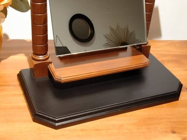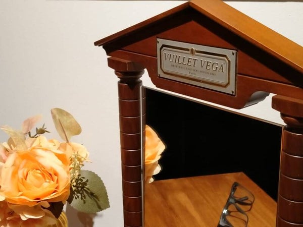 Présentoir à lunettes vintage Vuillet Vega, Orfèvres Lunetiers depuis 1843 (Paris). Joli petit meuble de métier avec miroir inclinable, en bois massif chêne moyen et noir. Objet peu coutumier qui apportera originalité et élégance à votre intérieur!
