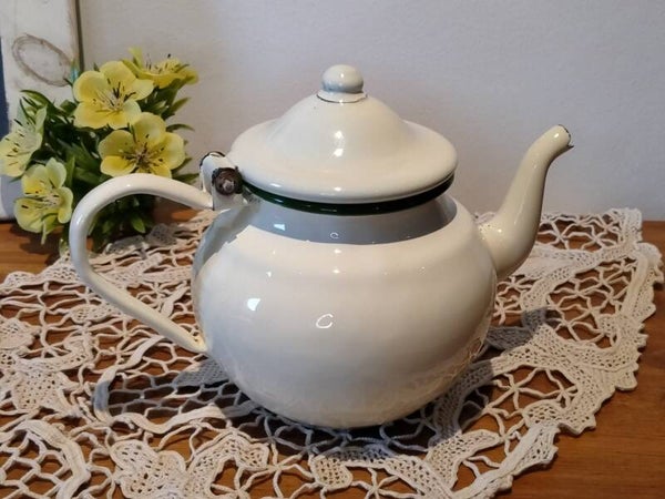 Jolie petite théière en tôle émaillée crème au décor olives vertes et noires sur l'avant! Touche déco intemporelle!