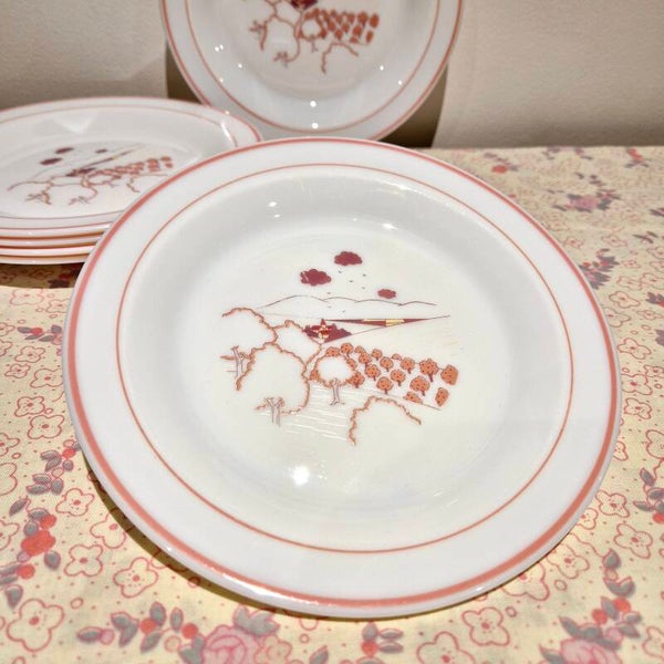 Ensemble de 6 assiettes à dessert vintage, modèle "Villaggio Rosa", Arcopal. En opaline blanche au décor bucolique village de campagne et pommiers dans les nuances de rose. Pour une table tout en douceur!