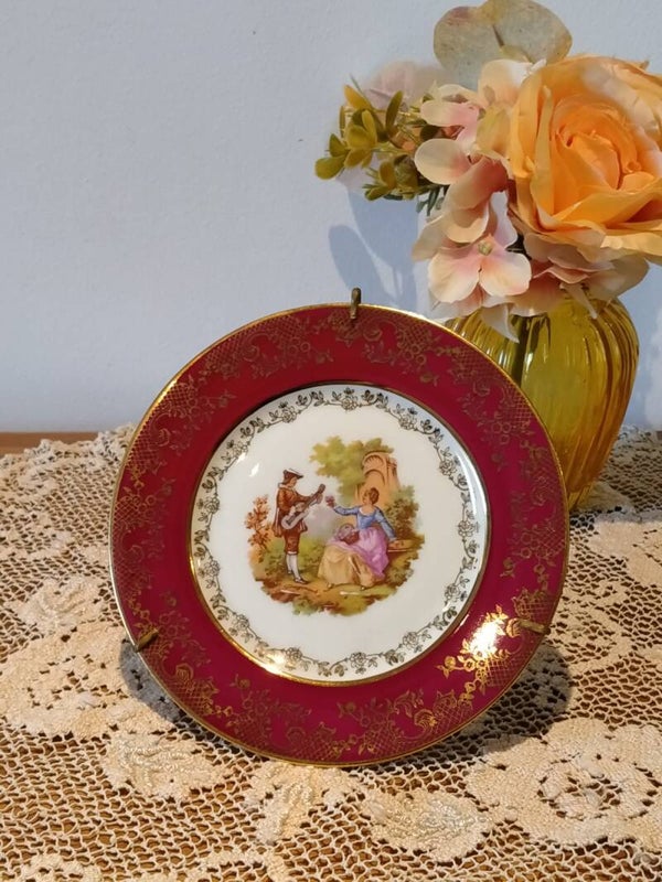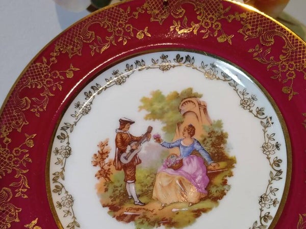 Petite assiette décorative ancienne sur support laiton. En porcelaine de Limoges blanche et bordeaux, décor romantique scène galante de "Fragonard", rehaussé main. Dorures florales sur les contours.