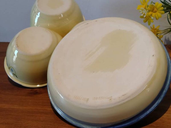 Duo de petits plats pour l'apéritif signés Lou Pignatier, poterie de renom à "Vallauris", toujours en activité. Plats de service à olives, tartinades ou autres gourmandises, en grès émaillé dans les nuances de jaune et bleu au fin décor floral.