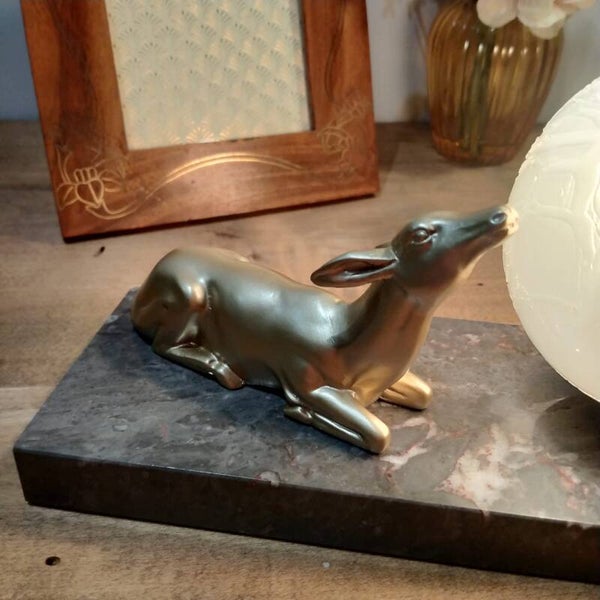Petite antiquité, cette lampe d'appoint ancienne (années 30) Art déco associant une base en marbre gris rosé, une biche (en régule) doré mat et une boule lumineuse en verre blanc givré texturé. L'ensemble a été restauré pour un rendu du plus bel effet! Vendue avec ampoule à baillonnette.
