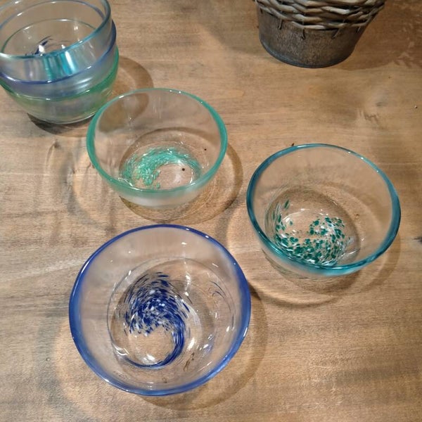 Ensemble de 6 élégantes coupelles vintage Linvosges de 3 couleurs différentes. Joli design, en verre transparent épais légèrement coloré et givré, décor façon "voie lactée" dans les tons de bleu, vert amande, vert émeraude et blanc. Très chic pour servir apéritif et dessert!