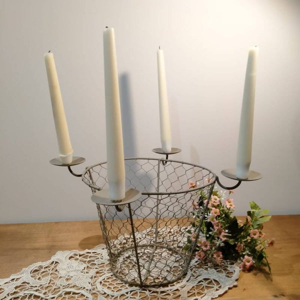 Original ce panier grillagé à 4 supports pour bougies! De forme ronde, en métal taupe mat. Supports pour bougies à piquer, rondes, cylindriques ou chandelles. 4 protections plastiques fournies. A remplir de fruits, fleurs séchées, pommes de pin...Il trouvera sa place dans une ambiance shabby, champêtre ou provençale!