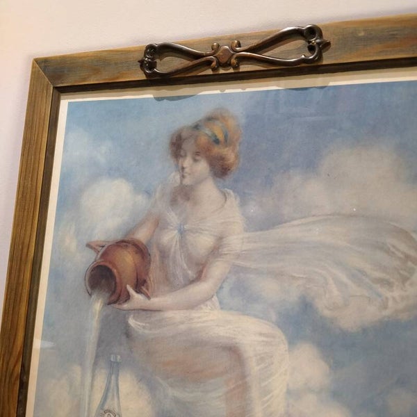 Peu commune, cette superbe grande affiche publicitaire vintage "Vittel Grande Source"! Impression d'inspiration mythologique, femme aux airs de déesse tenant une cruche. Cadre vitré en bois rustique, décoration en métal cuivré sur le haut. Pour une jolie touche rétro, poétique et romantique!