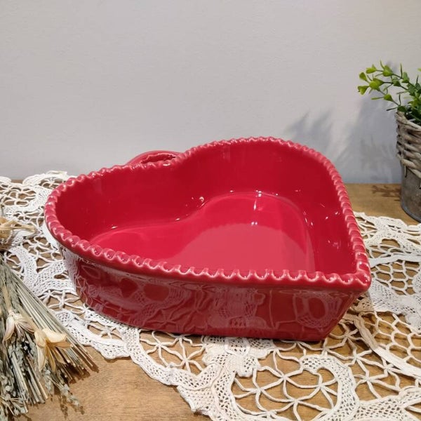 Plat en forme de coeur de chez Côté Maison. En céramique émaillée rouge au contour dentelé. Jolie touche romantique dans une ambiance campagnarde ou chalet de montagne!